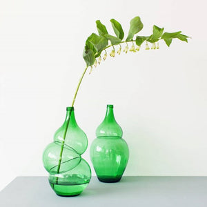 Deze design vaas is gemaakt van een groene wijnfles, die in het atelier van Klaas Kuiken in Arnhem wordt omgevormd tot een uniek object. Door zijn zelfontwikkelde blaastechniek – met aangepaste oven en compressor – ontstaan organische vormen die de verschillen in wanddikte van de fles benadrukken.